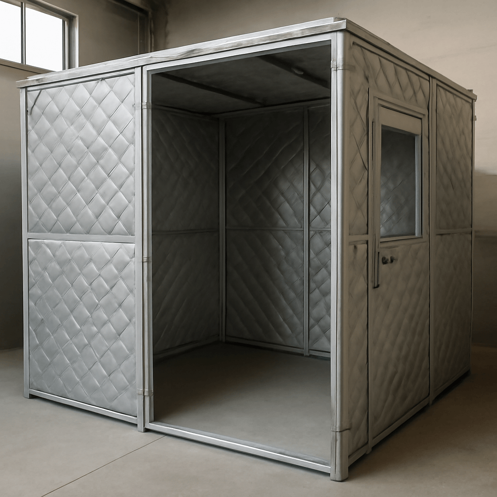 Paneles multicapa que integran fibra de vidrio comprimida para alta absorción sonora, junto con barreras de vinil de alta densidad para reducir la transmisión del ruido.